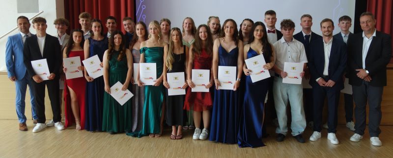 Für besonders herausragende schulische Erfolge überreichte Schulleiter Heiko Fähnle insgesamt elf Belobigungen und fünf Preise. Die Absolventen sorgten selbst für eine lockere und unterhaltsame Atmosphäre, indem sie das Programm mit eigenen Beiträgen mitgestalteten. Zum Abschluss bedankten sie sich herzlich bei ihren Lehrkräften für die Unterstützung auf ihrem Weg.