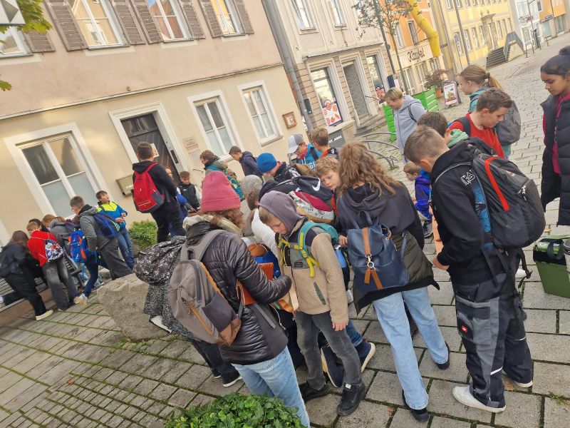 Am 8. Oktober 2025 fand unser Wandertag statt. Gemeinsam mit Frau Hirschle und der Parallelklasse machten wir uns kurz nach acht Uhr morgens auf den Weg nach Ellwangen. Am ZOB trafen wir Frau Schuster und Frau Meyer, mit denen wir anschließend zum Treffpunkt der Stadtfischer-Rally gingen. Dort stießen auch Frau Fischer und Frau Brenner zu uns – vielen Dank an dieser Stelle für Ihre Unterstützung! Insgesamt bildeten wir sechs Kleingruppen, die in zwei großen Teams gegeneinander antraten. Nach dem spannenden Escape-Game machten wir eine ausgiebige Vesperpause. Anschließend besuchte Frau Mayer mit einigen Kindern noch einen Buchladen. Zum Abschluss fuhren wir zurück zur Schule, wo wir den Tag mit einer Runde Fußball oder dem Smiley-Bewegungsspiel ausklingen ließen.